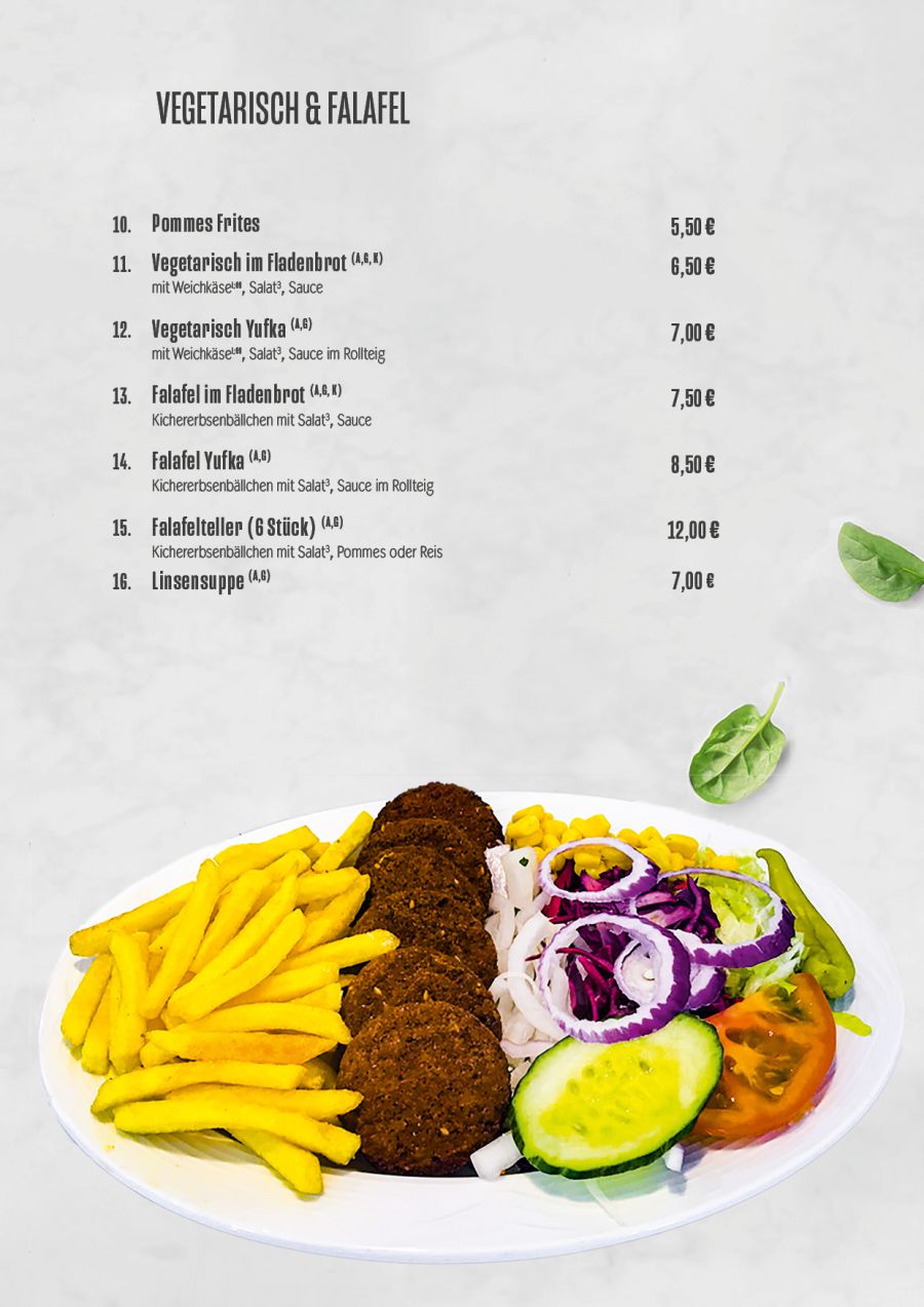 Sie bekommen bei uns Snacks wie Pommes, Falafel. Für Vegetarianer haben wir viele Variationen von Salaten und vegetarische Artikeln. Sie bekommen Saucen in verschiedene Variationen: Wahlweise mit Joghurtsauce, Cocktailsaucen, Balsamico oder Essig-Öl.